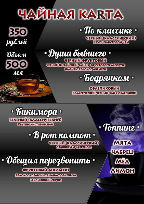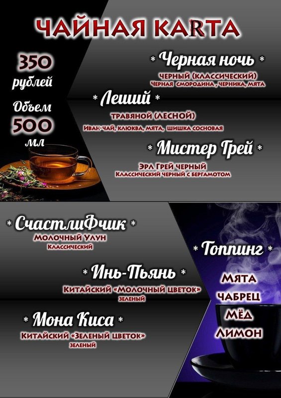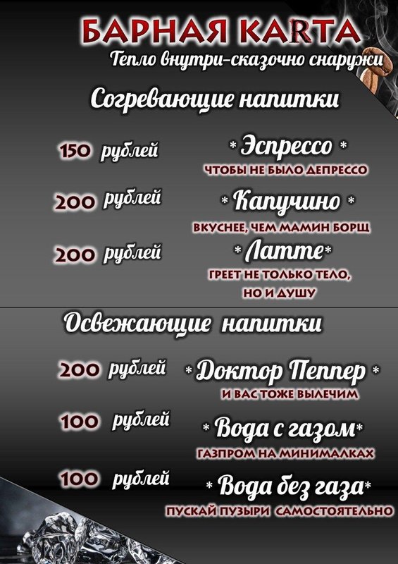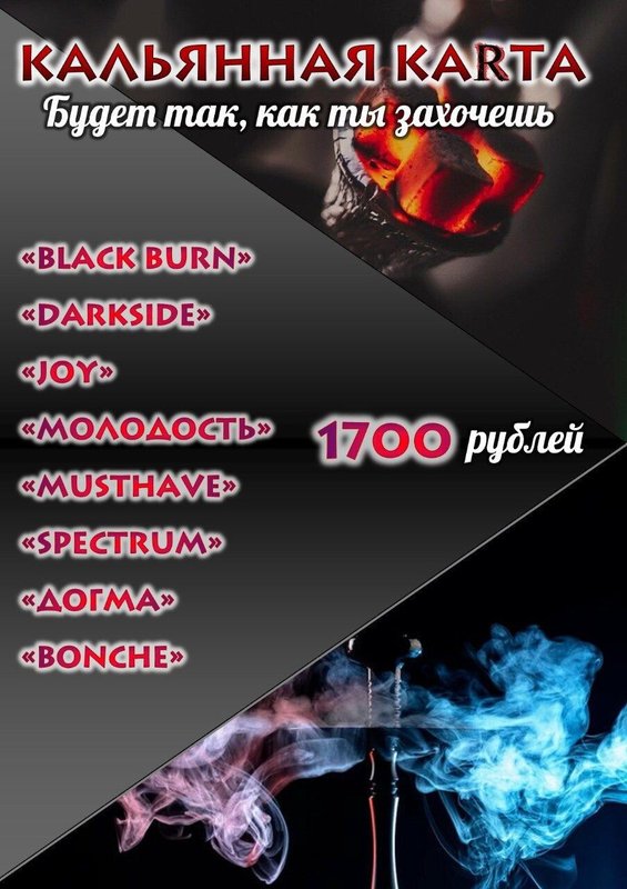 У нас вы также можете посидеть с кальянной трубкой. К вашим услугам широкий выбор табака в меню, стандартные и необычные способы приготовления от наших кальянщиков.